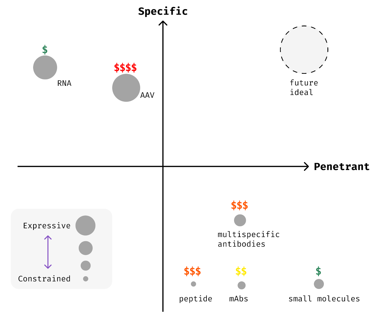 Once targets are known, the largest challenge in building a therapy is delivering a medicine that is sufficiently expressive to the right cells and tissues. Today, our therapeutic approaches each make harsh trade-offs between the axes of penetrance (how many cells are affected), specificity (how many of the right cells vs. the wrong cells), and expressivity (how sophisticated the effect is within the target cells).