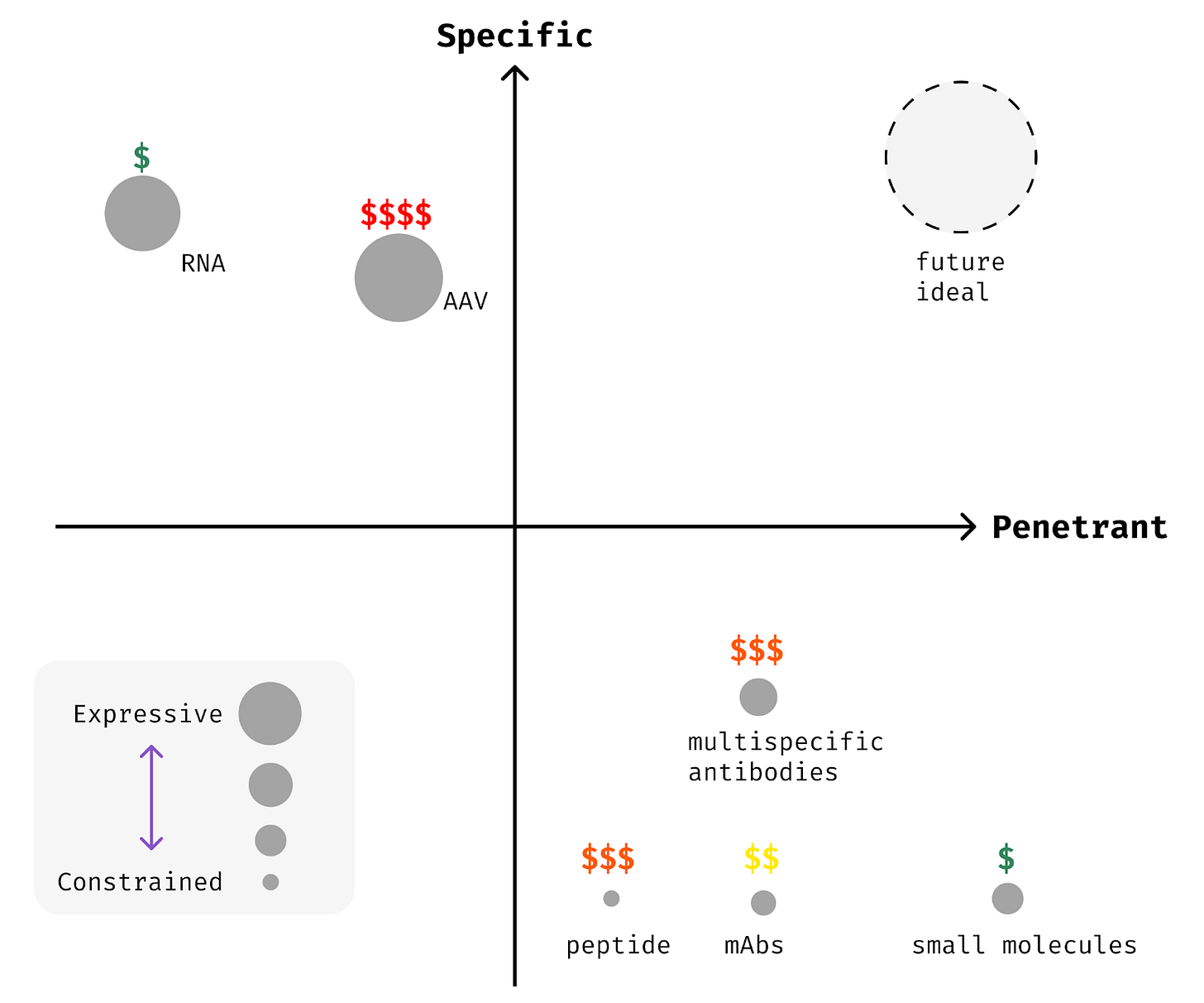 Emerging modalities like nucleic acid therapies (RNA and DNA medicines) can often be made specific, but they are rarely penetrant. Most nucleic acid medicines can be delivered only to a handful of cells and tissues today. Addressable cell types for RNA medicines are limited to those where modified RNAs or lipid vehicles like LNPs can travel. Canonically, the liver is the easiest place to target because it’s biologically optimized to filter these types of particles from your circulation. Immune cells and endothelial cells lining your veins and arteries can be targeted with a bit more effort.