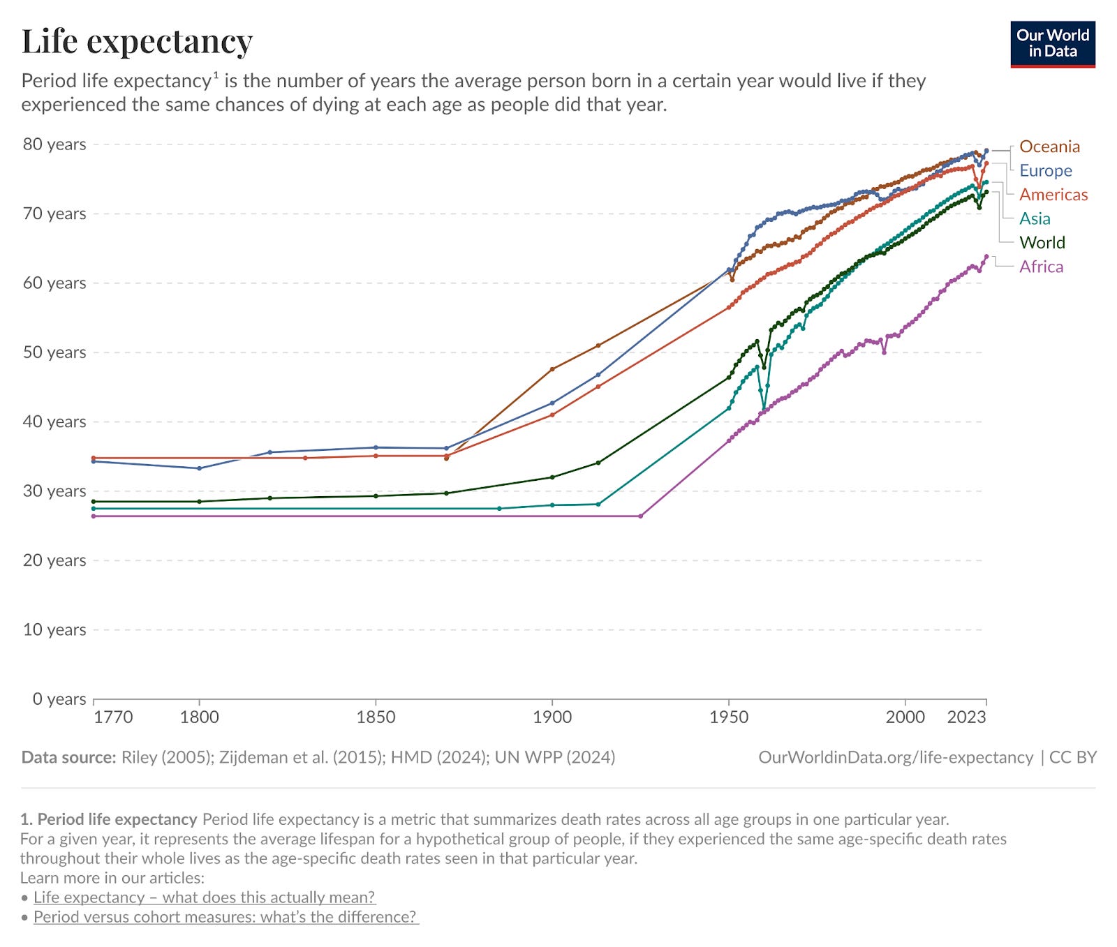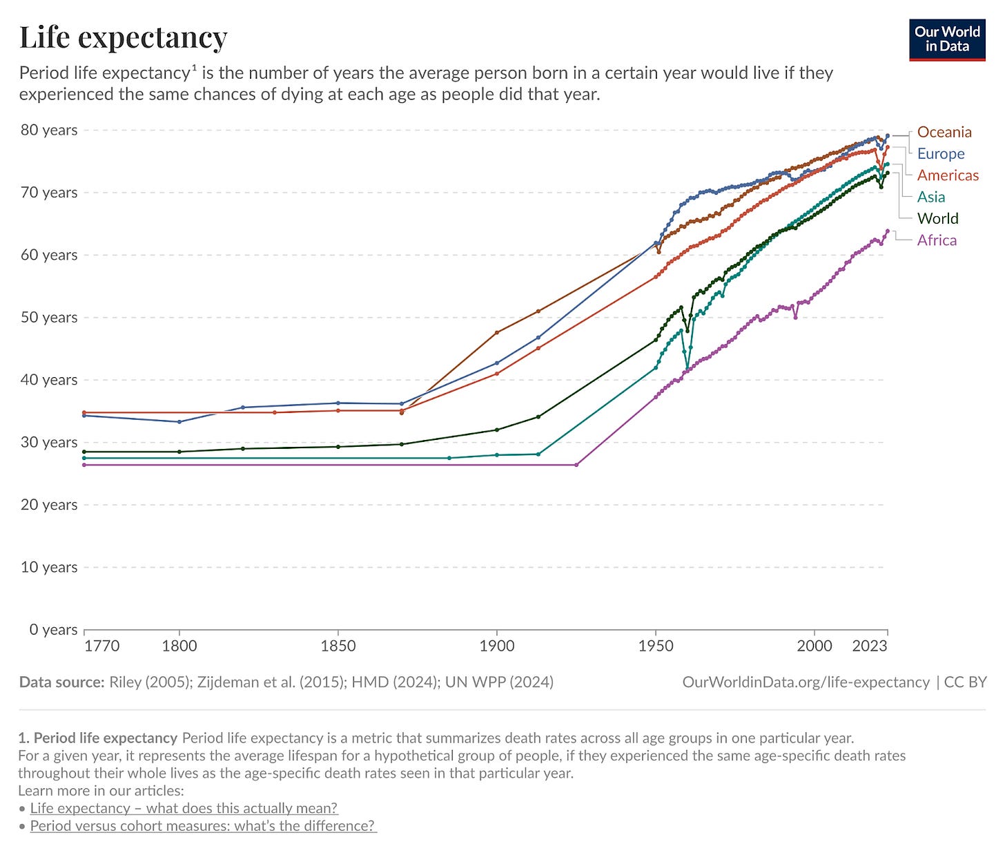 Even the least wealthy geographies are experiencing the same upward trend of progress. The average lifespan worldwide today is nearly a decade longer than the average lifespan of the wealthiest geography in 1950.